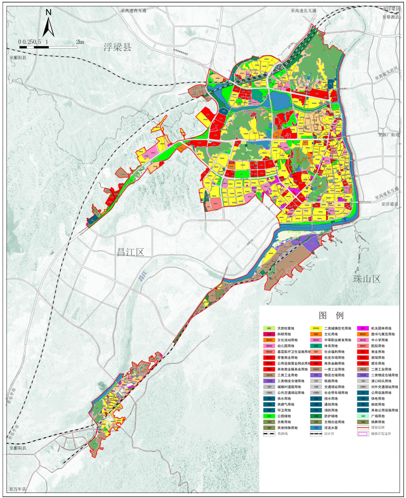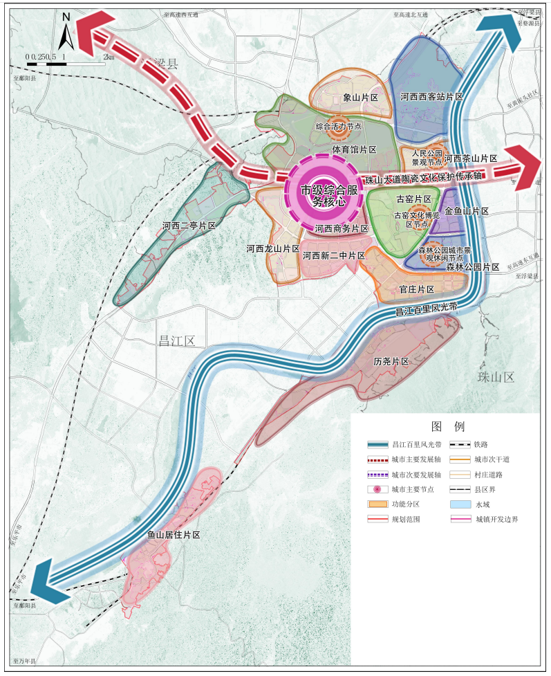 根据昌江区河西片区用地特征和功能需求,规划形成“一轴、一带、一核、多区”的空间发展格局。