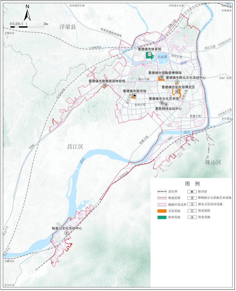 规划保留现状市级文化设施6处,为景德镇市图书馆、景德镇中国陶瓷博物馆、景德镇市智慧旅游体验馆、景德镇古窑民俗博览区、景德镇市文化艺术馆、景德镇市群众文化活动中心。保留街道社区级文化设施1处。