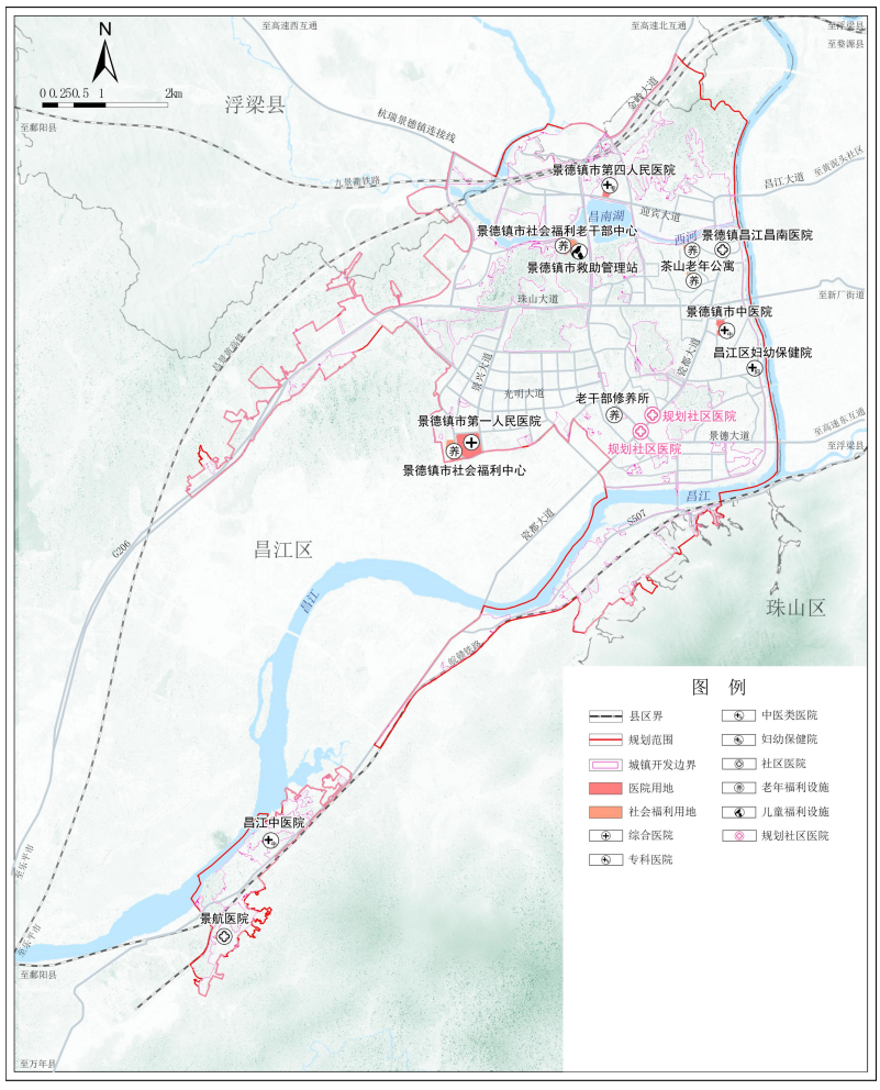 规划保留现状7处市级医疗卫生设施,为景德镇市第一人民医院、景德镇市中医院、景德镇市第四人民医院、昌江区中医院、昌江区妇幼保健院、昌南医院和景航医院。规划2处街道社区级医疗卫生设施,在紫晶路与瓷都大道交叉口的北侧和西侧各新建1 处社区医院。