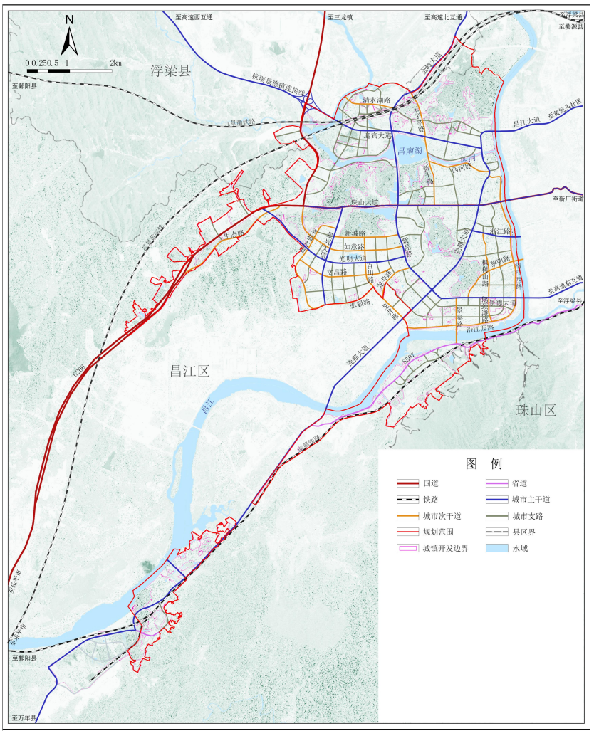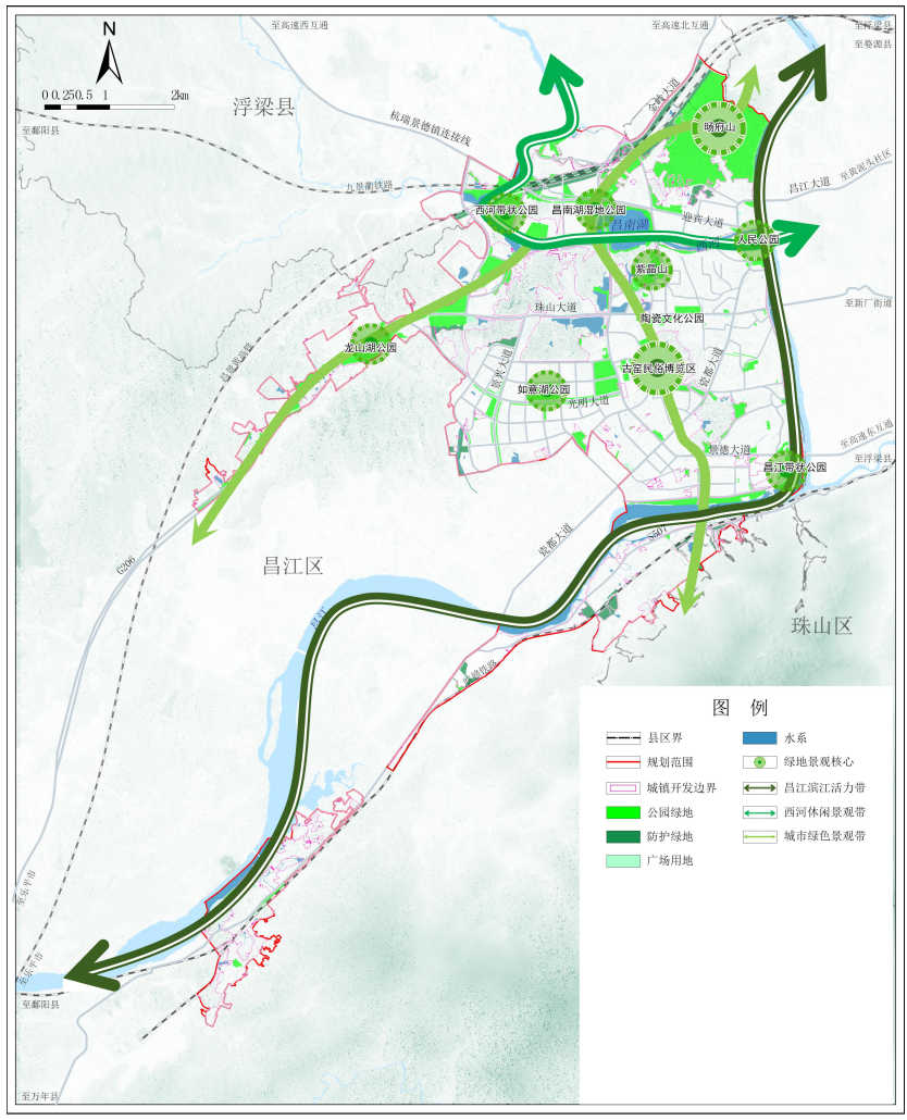 三带:指昌江滨江活力带、西河休闲景观带、城市绿色景观带;