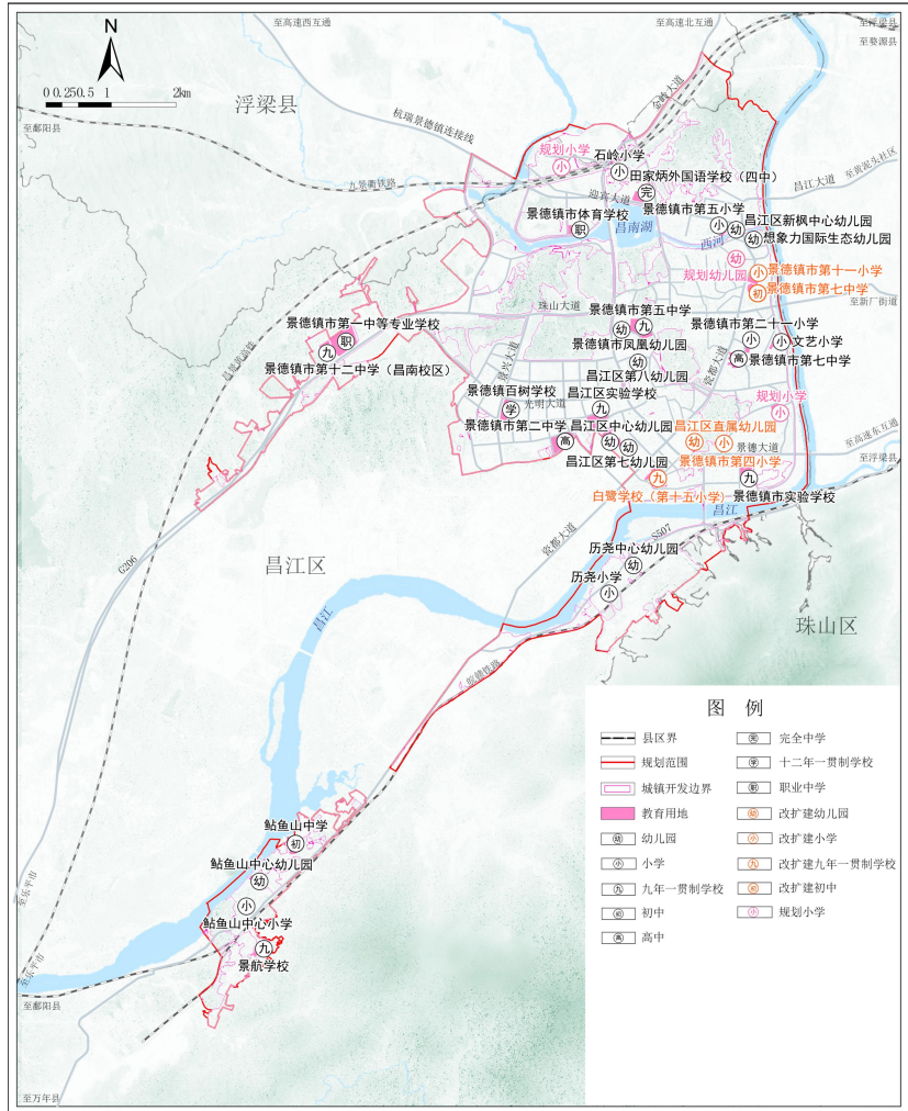 划改扩建5处教育设施,为景德镇市第七中学(初中部)、白鹭学校(第十五小学)、景德镇市第十一小学、景德镇市第四小学、昌江区直属幼儿园;改扩建1处区级教育设施,为昌江区直属幼儿园。在迎宾大道北侧、金岭大道西侧及新风支路南侧、沿江西路西侧规划新增小学2处。