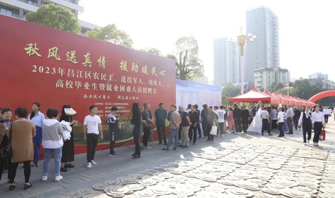 10月31日,由昌江区人社局、昌江区就业创业服务中心主办,新枫街道劳动保障所承办,区妇联协办的“秋风送真情,援助暖民心”招聘活动在昌江区新枫街道河西古码头如期举行。