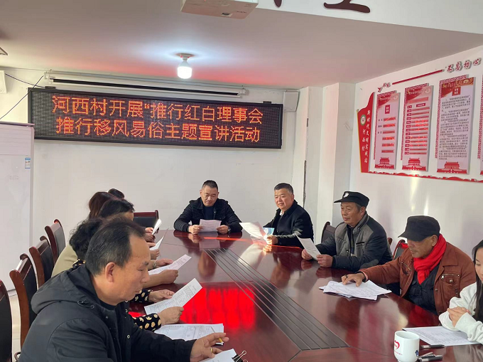 为大力弘扬中华民族传统美德,积极培育和践行社会主义核心价值观,深入推进移风易俗,营造风清气正、文明节俭的社会风气,以社会主义核心价值观为引领,坚持自治、法治、德治相结合,2023年11月14日河西村委会新时代文明实践站开展了“推行红白理事会 推进移风易俗”主题宣讲活动,邀请了辖区群众来参加,运用红白理事会倡导婚事新办、丧事简办,遏制陈规陋习蔓延,推进文明乡风建设,助力乡村振兴。