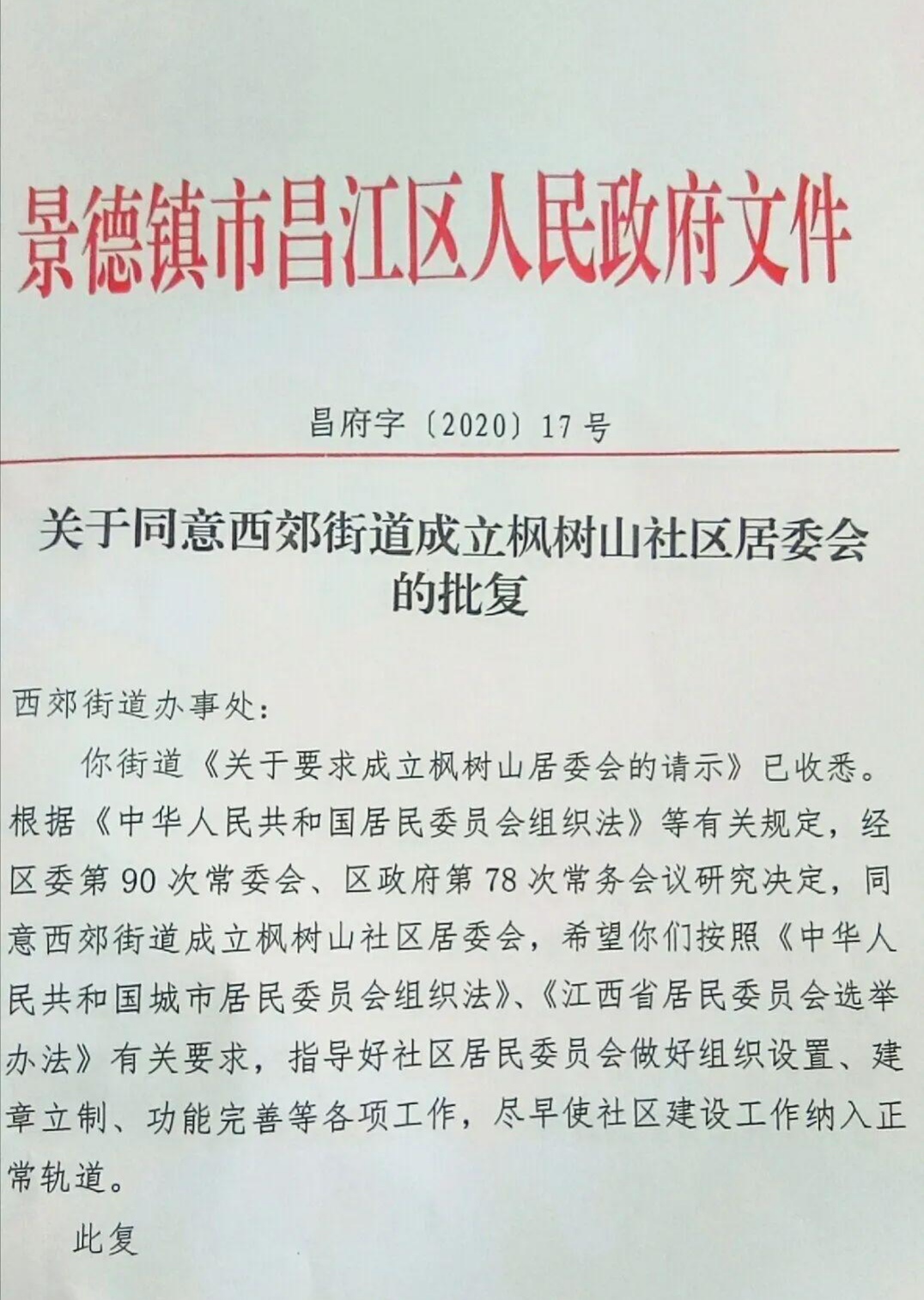 2020年4月28日,为缓解和分担枫树山林场社会职能和西郊街道森林社区管理上的压力,昌江区人民政府在关于同意西郊街道成立枫树山社区居委会的批复中表示,根据《中华人民共和国城市居民委员会组织法》等有关规定,经昌江区委第90次常委会、区政府第78次常务会议研究决定,同意西郊街道成立枫树山社区居委会。