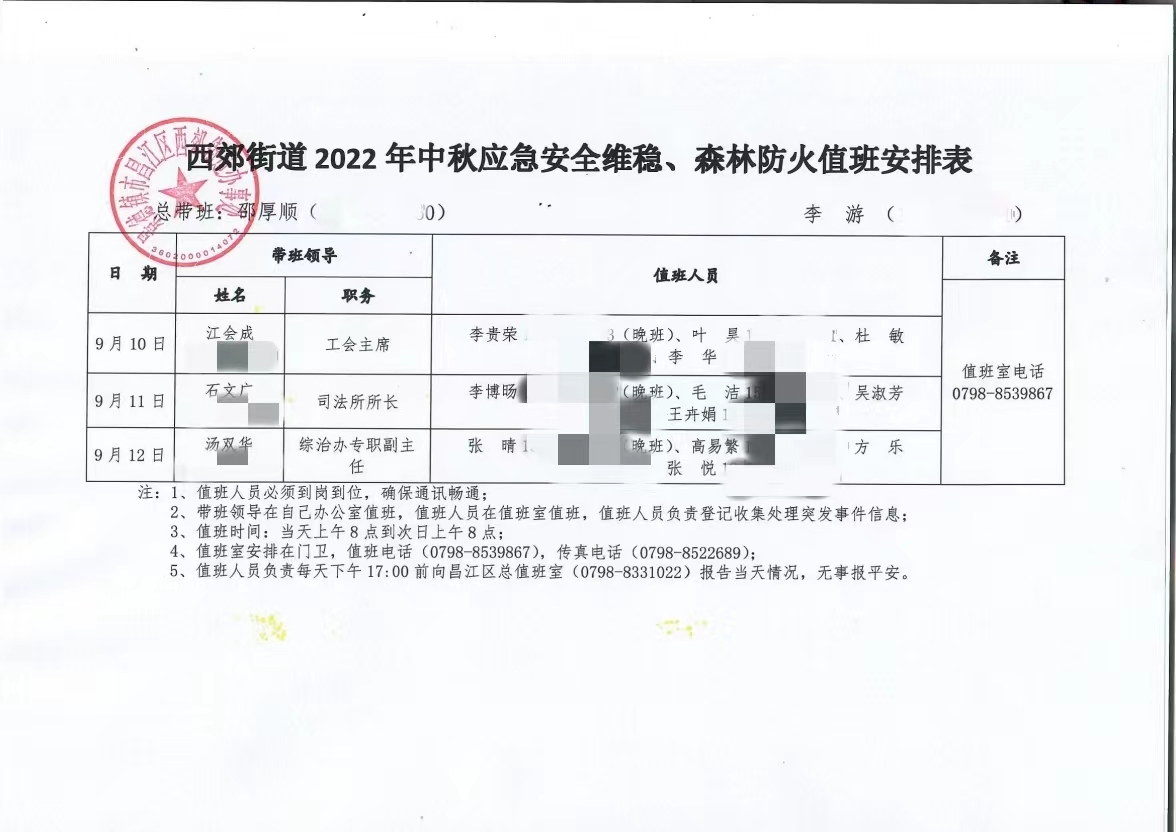 西郊街道2022年中秋应急安全维稳、森林防火值班安排表