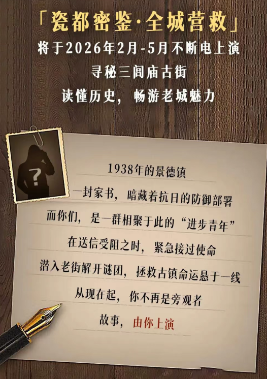 在三闾庙历史文化街区,一场《瓷都密鉴・全城营救》沉浸式剧本游让游客们穿越时空,复刻民国风情。电影级的沉浸场景搭配青年演员们深入人心的表演,将大家带回那个战火纷飞的年代,沉浸式感受民国时期景德镇的风云变幻。游客们化身剧中角色,在街巷间解谜探案,既触摸到了历史的肌理,也体验到了文旅融合的全新玩法,不少游客表示,这场“穿越之旅”让瓷都的历史故事变得可感可触。