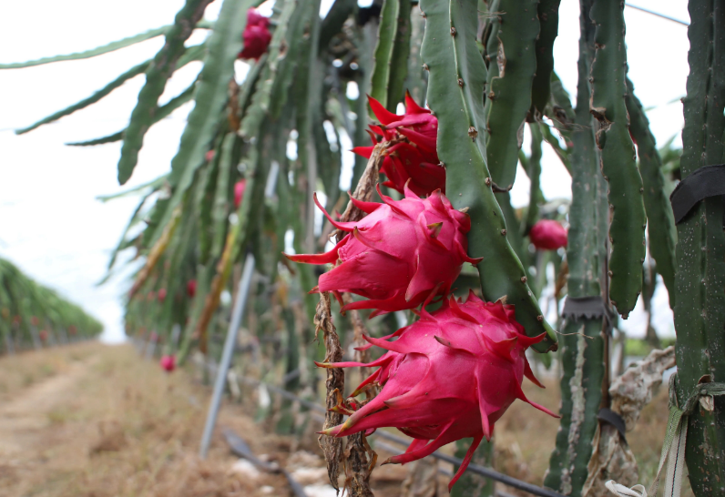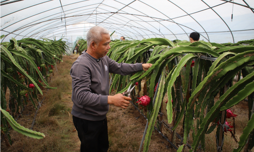 据了解,大棚蔬果种植项目于2020年开始实施,是当地产业扶贫项目之一,大棚种植火龙果、葡萄等近百亩蔬果,火龙果约占40亩。2022年,村集体通过出租土地等方式,强化项目自身“造血功能”,引进火龙果专业种植团队,开启了这段“甜蜜果实”产业发展的新篇,成为带动村民增收的“致富果”。