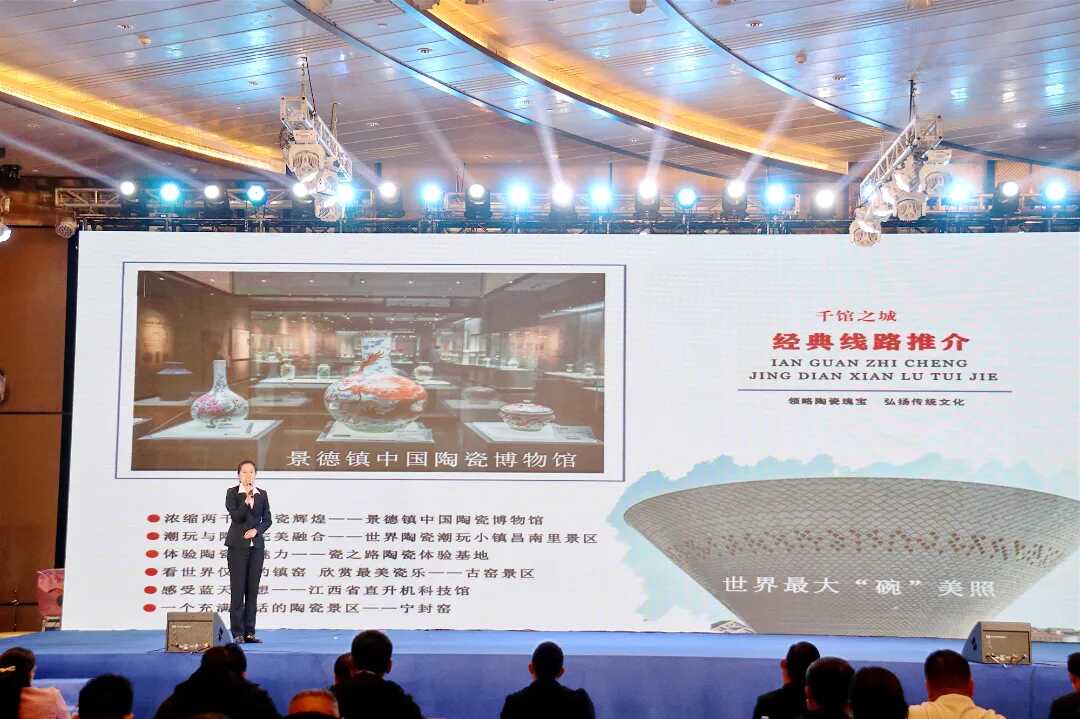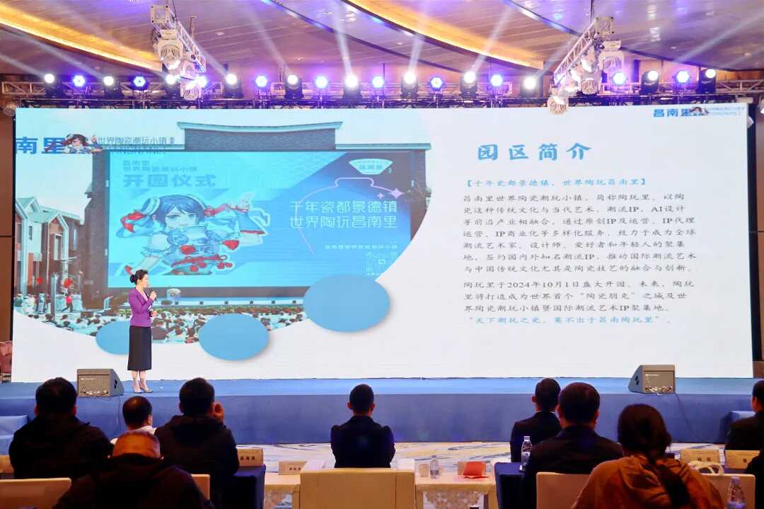“昌南里世界陶瓷潮玩小镇(陶玩里),位于江西省景德镇市昌江区昌南大道与G206国道交汇处,是一个集陶瓷文化、潮流艺术与美食于一体的绝佳旅游目的地。无论你是艺术爱好者、美食家还是摄影达人,这里都能满足你的所有期待。”“昌江区、高新区将携手共进,全力打造‘千年瓷都·景秀china’品牌,使城市‘瓷文化’特色更为浓厚,‘潮元素’个性更为突出,‘瓷产品’内容更为丰富……”昌江、高新两区融合文旅推介官通过文旅宣传片向与会嘉宾作了声情并茂的推介,将昌南里、航空小镇、景德镇中国陶瓷博物馆、古窑民俗博览区、江西直升机科技馆等景区与美景美食结合的旅游线路一一呈现给了大家,充分展示了景德镇地区丰富的旅游资源和深厚的文化底蕴。
