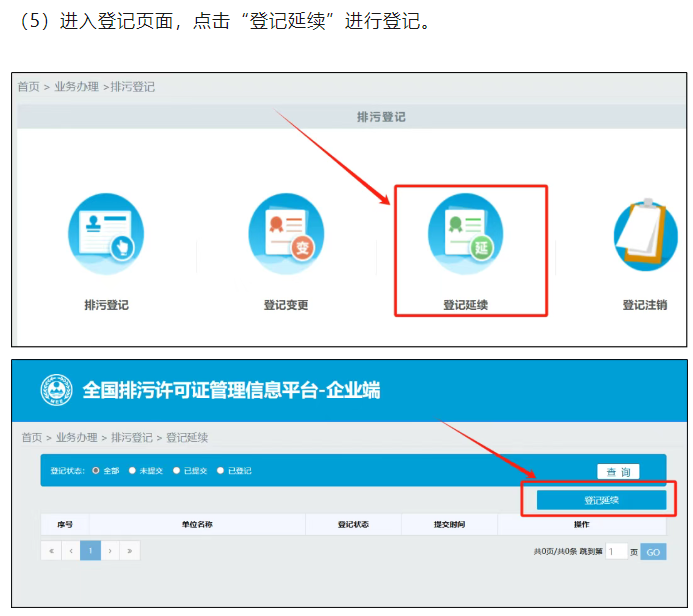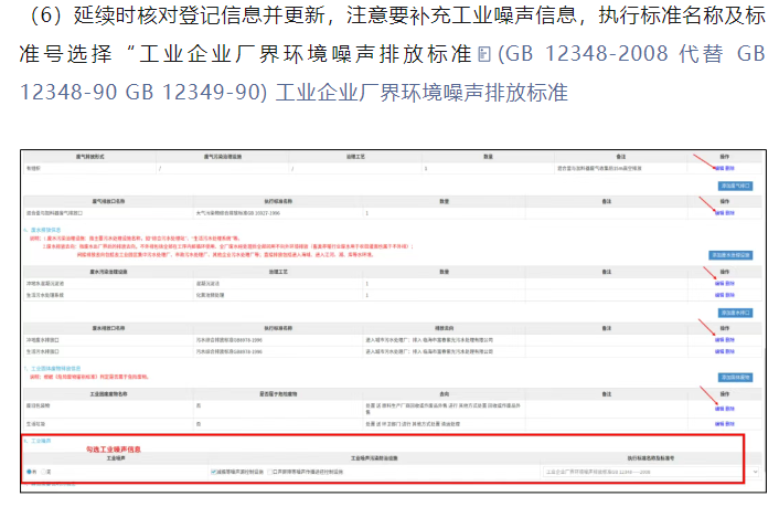 1.排污单位延续排污登记时,应认真核实排污登记单位名称、统一社会信用代码、生产经营场所所在地、行业类别、法定代表人或者实际负责人、联系方式等基本信息,以及污染物排放去向、排放口数量、执行的污染物排放标准及采取的污染防治措施等信息记载是否准确,如实填报延续登记内容,涉及产生工业固废和工业噪声的单位还应补充填报相应模块信息。