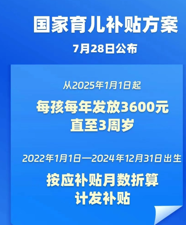 据新华社,国家育儿补贴制度实施方案7月28日公布。从2025年1月1日起,对符合法律法规规定生育的3周岁以下婴幼儿发放补贴,至其年满3周岁。