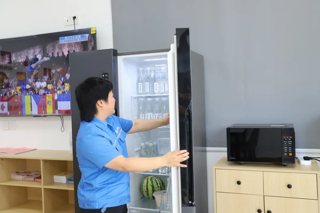 面积80平方米的新枫街道嘉和社区工会驿站,24小时对外开放,空调、手机多功能充电器、饮水机、冰箱、微波炉、吹风机等设施一应俱全,传递着“冷可取暖、热可纳凉、渴可喝水、累可歇脚、伤可用药”的关怀。一位户外职工感慨道:“工会关心我们基层在外面跑的职工,在这个炎热的夏天,能在驿站内喝上一口冰水,让我们的内心感到一丝丝的凉意。”目前,全区28个“工会驿站”均已备好降温设施,为户外工作者送去阵阵清凉。