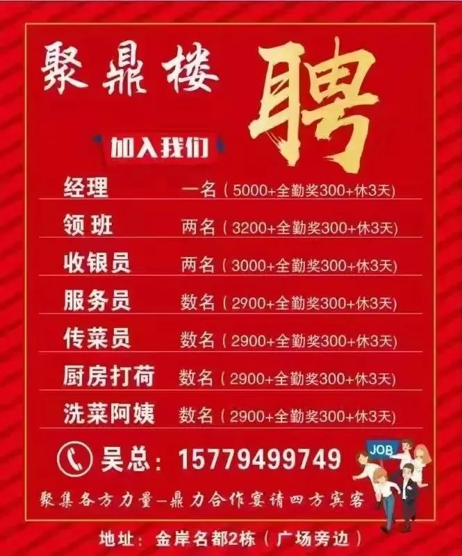 诚聘仓管员、收银员、服务员、传菜生、洗碗、洗菜,配菜、上单,切配、油炸、锅底、刨制、保洁