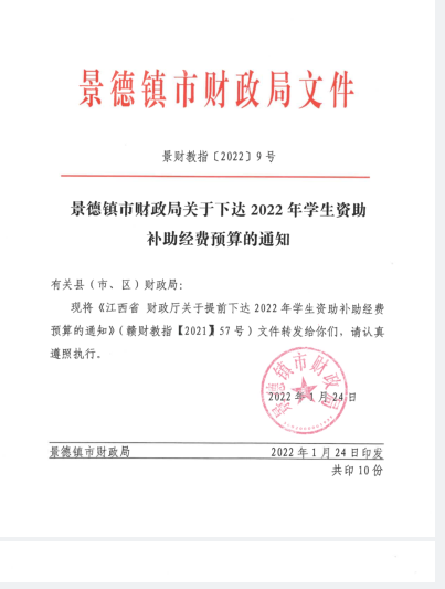 景德镇市财政局关于下达2022年学生资助补助经费预算的通知