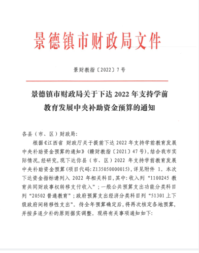 景德镇市财政局关于下达2022年支持学前教育发展中央补助资金预算的通知