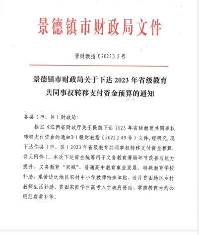 景德镇市财政局关于下达2023年省级教育共同事权转移支付资金预算的通知
