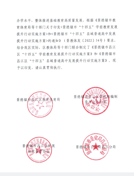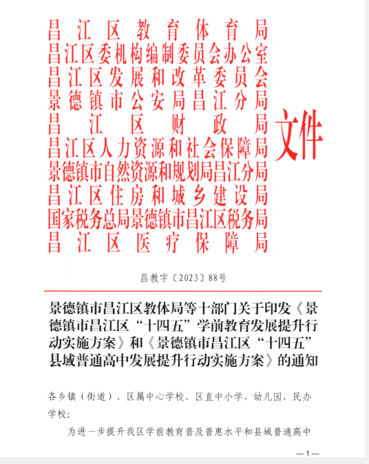 景德镇市昌江区教体局等十部门关于印发《景德镇市昌江区“十四五”学前教育发展提升行动实施方案》和《景德镇市昌江区“十四五”县域普通高中发展提升行动实施方案》的通知pdf