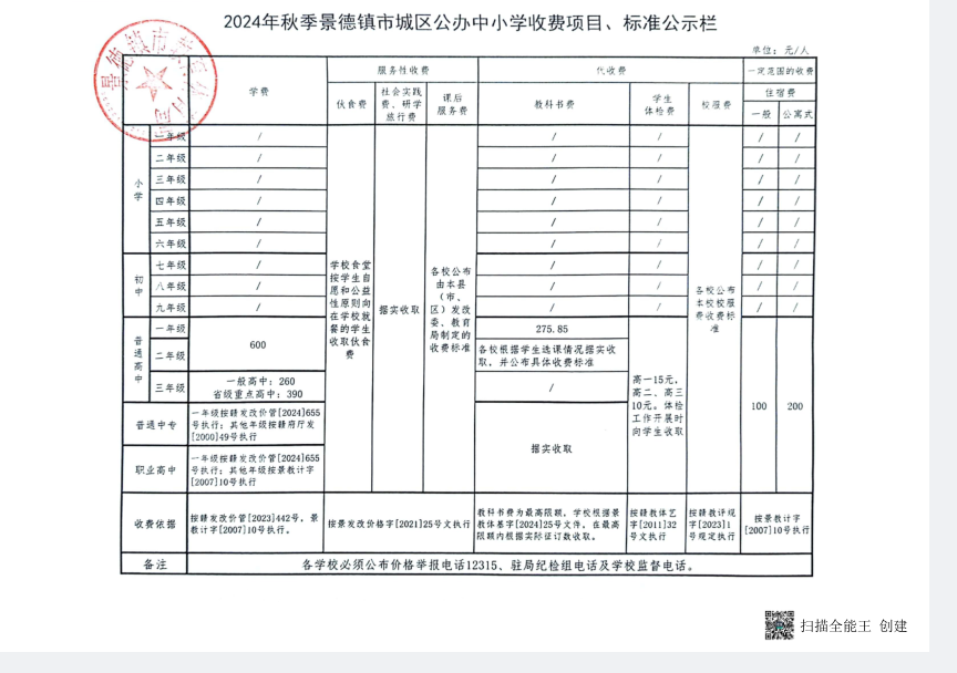 2024年秋季景德镇市城区公办中小学收费项目、标准公示栏