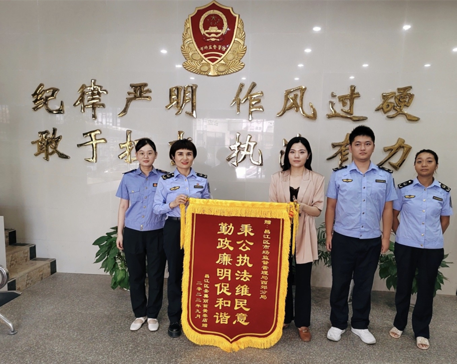 9月13日下午,昌江区圣莫丽兹美容店负责人刘女士,来到昌江区市监局西郊分局,将一面书写“秉公执法维民意 勤政廉明促和谐”的锦旗,赠给西郊分局全体工作人员,以表达自身的感激之情。
