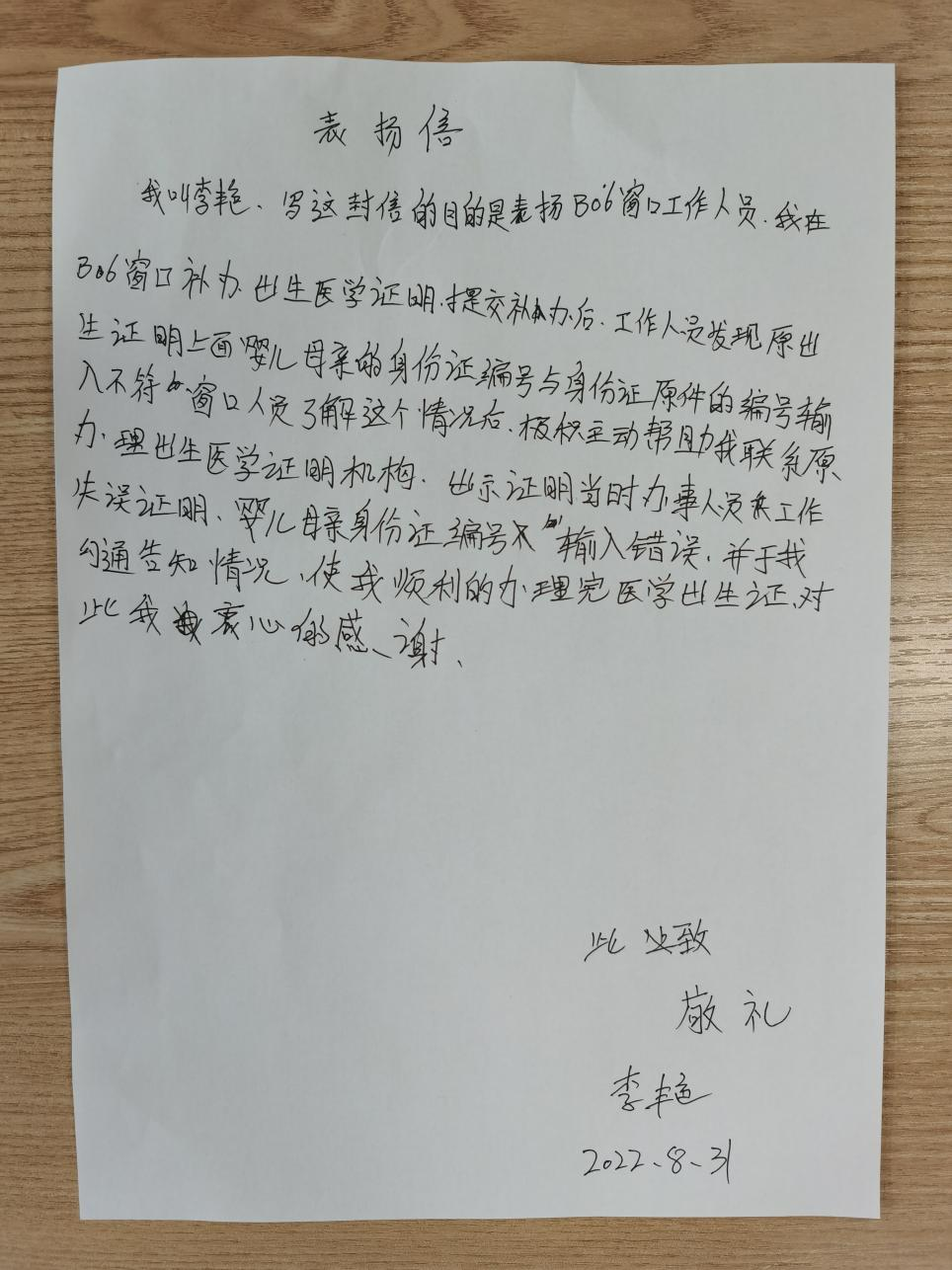 日前,李女士来到昌江区政务服务中心办理业务,对卫健委窗口工作人员蔡丽华的服务,表示衷心感谢。据了解,当天李女士是因为小孩的出生医学证明丢失,需要到昌江区政务服务中心补办,提交相关材料后,卫健委窗口工作人员发现李女士的原出生证上面的身份证号码与她公民身份证件上的号码不符,故暂时无法补办新的出生证。需要李女士先提供原办证机构的一个错误证明才能继续走补办流程,卫健委窗口工作人员蔡丽华没有把问题和矛盾推给群众,一方面积极与李女士反馈沟通情况,另一方面,为了让李女士不跑路少跑路,主动与原办证机构核实情况,并请其机构出示因当时办事人员失误而打错身份证号的证明文件。第二天李女士直接到原办证机构领取证明文件后再次来到卫健委窗口,顺利补办了出生证。李女士对卫健委窗口工作人员的热情服务非常满意,特意写下表扬信表达自己的感谢之情。