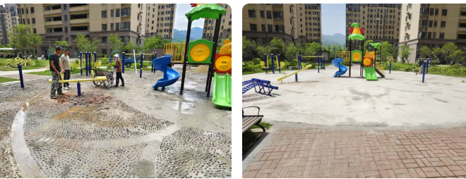 “为保障小朋友与老人活动安全,我们请施工团队对小区设施进行改造升级,将儿童滑滑梯及健身器材区域原本凹凸锋利的鹅卵石地面,改造为平整稳固的水泥路面,有效降低意外磕碰风险。”园林社区相关负责人表示。