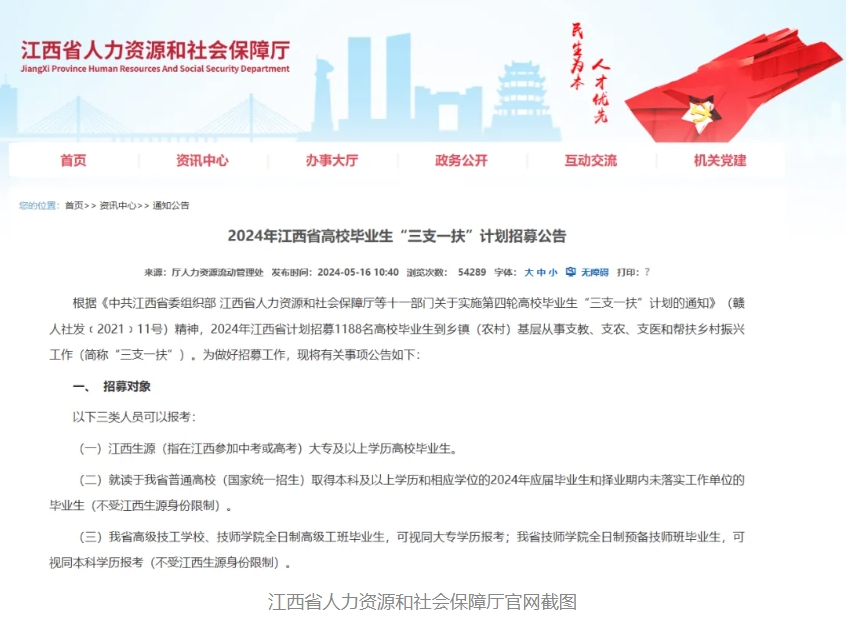 根据《中共江西省委组织部 江西省人力资源和社会保障厅等十一部门关于实施第四轮高校毕业生“三支一扶”计划的通知》(赣人社发﹝2021﹞11号)精神,2024年江西省计划招募1188名高校毕业生到乡镇(农村)基层从事支教、支农、支医和帮扶乡村振兴工作(简称“三支一扶”)。为做好招募工作,现将有关事项公告如下: