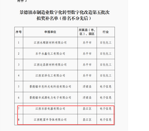 近日,景德镇市第五、六批制造业数字化改造奖补资金申报结果相继公布,昌江区多家企业凭借扎实的数字化转型成效成功斩获政策红利。其中,江西乐彭电器有限公司、江西乾富半导体有限公司分别获得50万元奖补,景德镇市焦化能源有限公司获得40万元奖补。