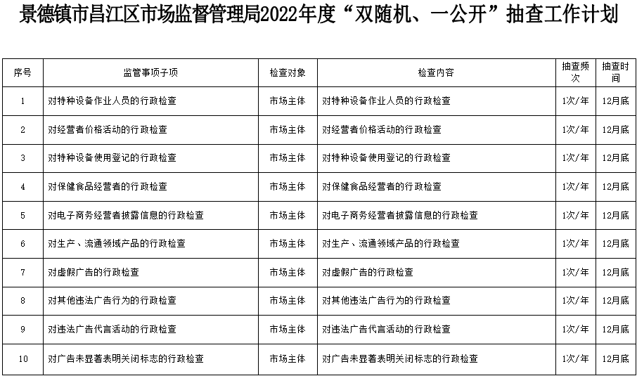 景德镇市昌江区市场监督管理局2022年度“双随机、一公开”抽查工作计划