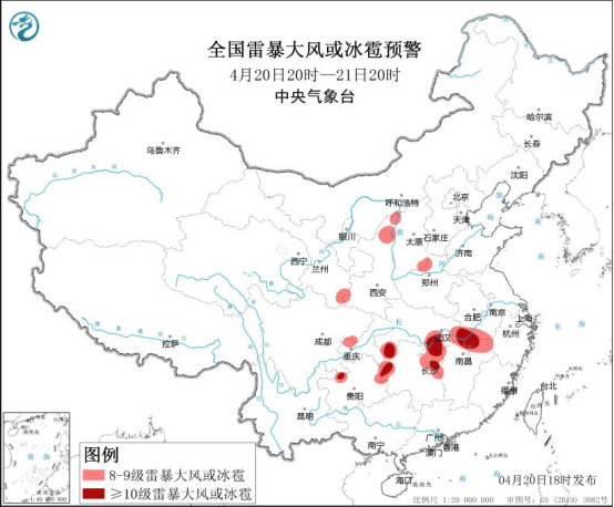 图1全国雷暴大风或冰雹预警图(4月20日20时-4月21日20时)