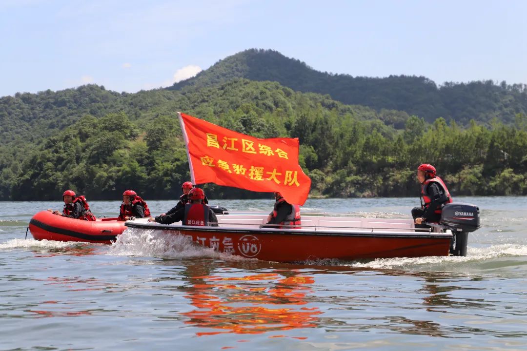 市应急管理局党组书记、局长乐忠,昌江区委常委、常务副区长彭新建出席并宣布水域救援联合演练正式开始。