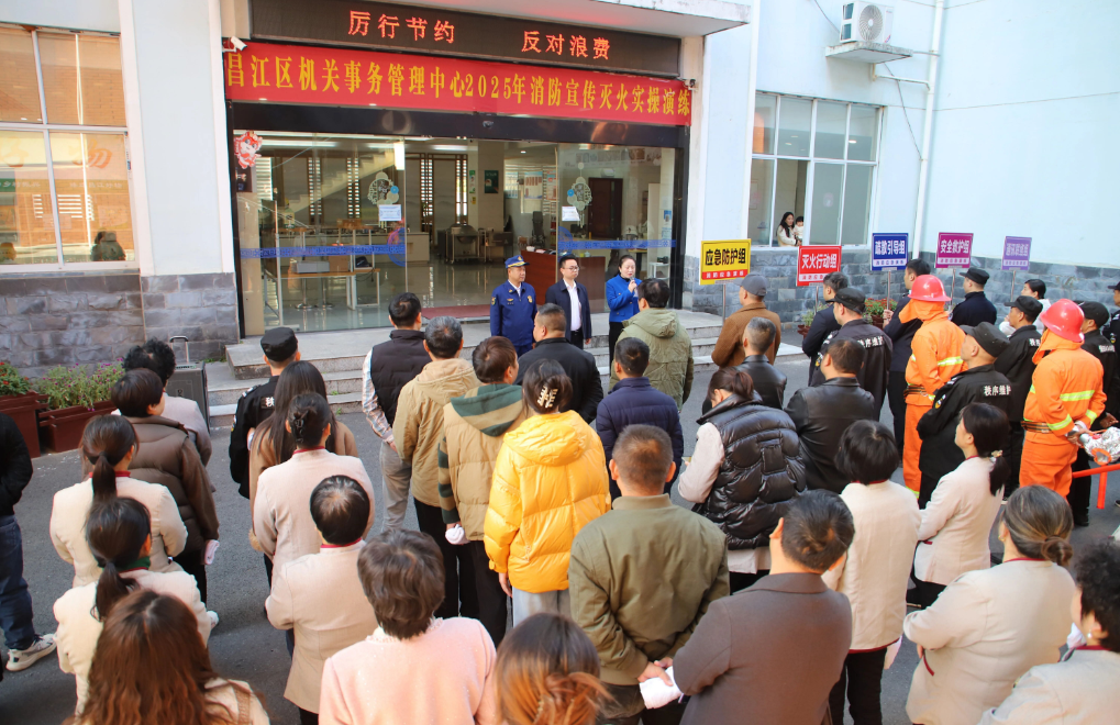 12月1日上午,昌江区机关事务服务中心联合区消防救援大队在区政府机关大院举行消防灭火实操演练。区委常委、常务副区长彭新建出席并宣布活动开始。区消防救援大队负责人出席活动。区机关事务服务中心全体干部职工、安保人员和食堂职工共50余人参加演练。