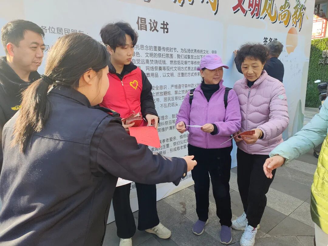活动中摆放文明标语展板,发放倡议书,党员们向群众宣传讲解移风易俗的重要意义,劝导采用文明、安全、节俭的方式祭奠故人,在党员的带领下,现场群众纷纷在活动展板上签名,承诺从自身做起,坚持文明祭祀寄哀思。