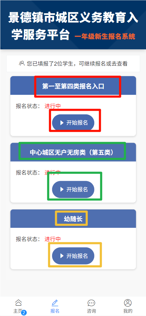 点击开始报名,进入下一步。这里以第一至第四类报名入口为例。