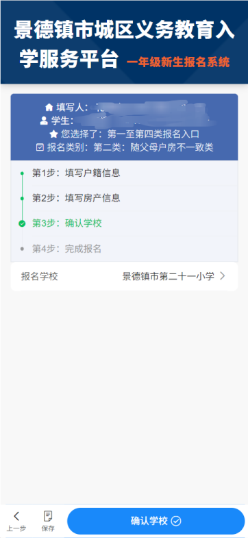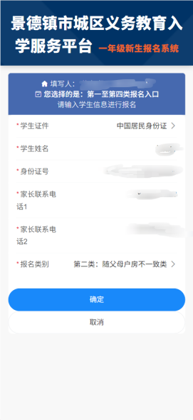 填写学生姓名、身份证号、家长联系电话1、家长联系电话2、报名类别,这里以第二类:随父母户房不一致为例