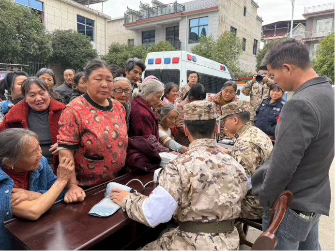 活动当天,武警官兵们一到现场便迅速布置好服务点,随即投入志愿服务中。在医疗志愿服务区,武警军医耐心细致地为前来问诊的村民测量血压,同时耐心解答村民们的各种健康疑问,并依据不同情况给出专业的诊疗建议和日常保健指导。