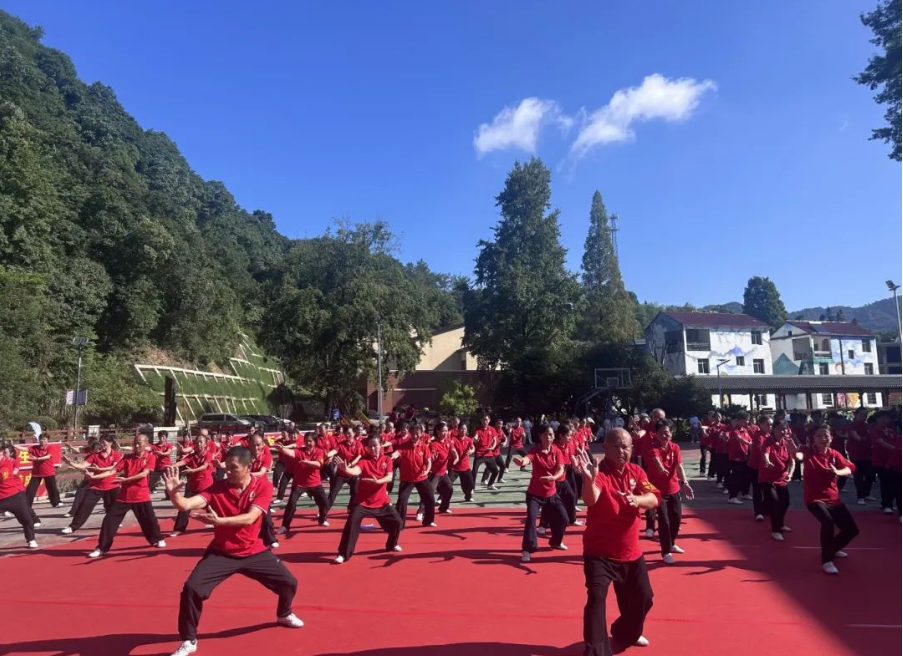 随后,200 余名表演者带来气势恢宏的集体展演,八段锦、八法五步太极拳展现中华武术底蕴。随后,来自全区各乡镇、协会和武校的12支精英队伍轮番献艺,恒豹武校的雄狮与大刀、丽阳太极队的功夫扇等节目异彩纷呈,赢得阵阵喝彩。