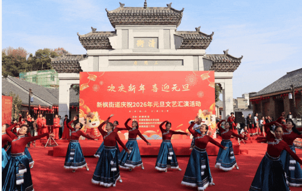 节日的喜庆氛围早已浸润社区肌理。2025年12月31日下午,新枫街道主办的“欢庆新年 喜迎元旦”文艺汇演在三闾庙清街广场热闹开演。这场汇演以丰富的节目和趣味互动,为辖区居民打造了一场温馨满满的跨年文化盛宴,让社区邻里在欢声笑语中携手迎接2026年的到来。新枫街道英姿舞蹈队带来的开场舞《从此眼里都是你》动感十足,一登场便瞬间点燃现场气氛;志愿者们倾情演唱的《如愿》《Newboy》《明天会更好》等歌曲,温暖了在场每一位观众的心。除了精彩的节目表演,现场还设置了新年知识问答、趣味猜灯谜、“新年愿望墙”留言等互动环节。观众们踊跃参与,答对灯谜、完成互动任务的居民收获了春联、福字、坚果礼盒等元旦主题礼品,在趣味互动中尽情感受节日的欢乐与邻里的温情。