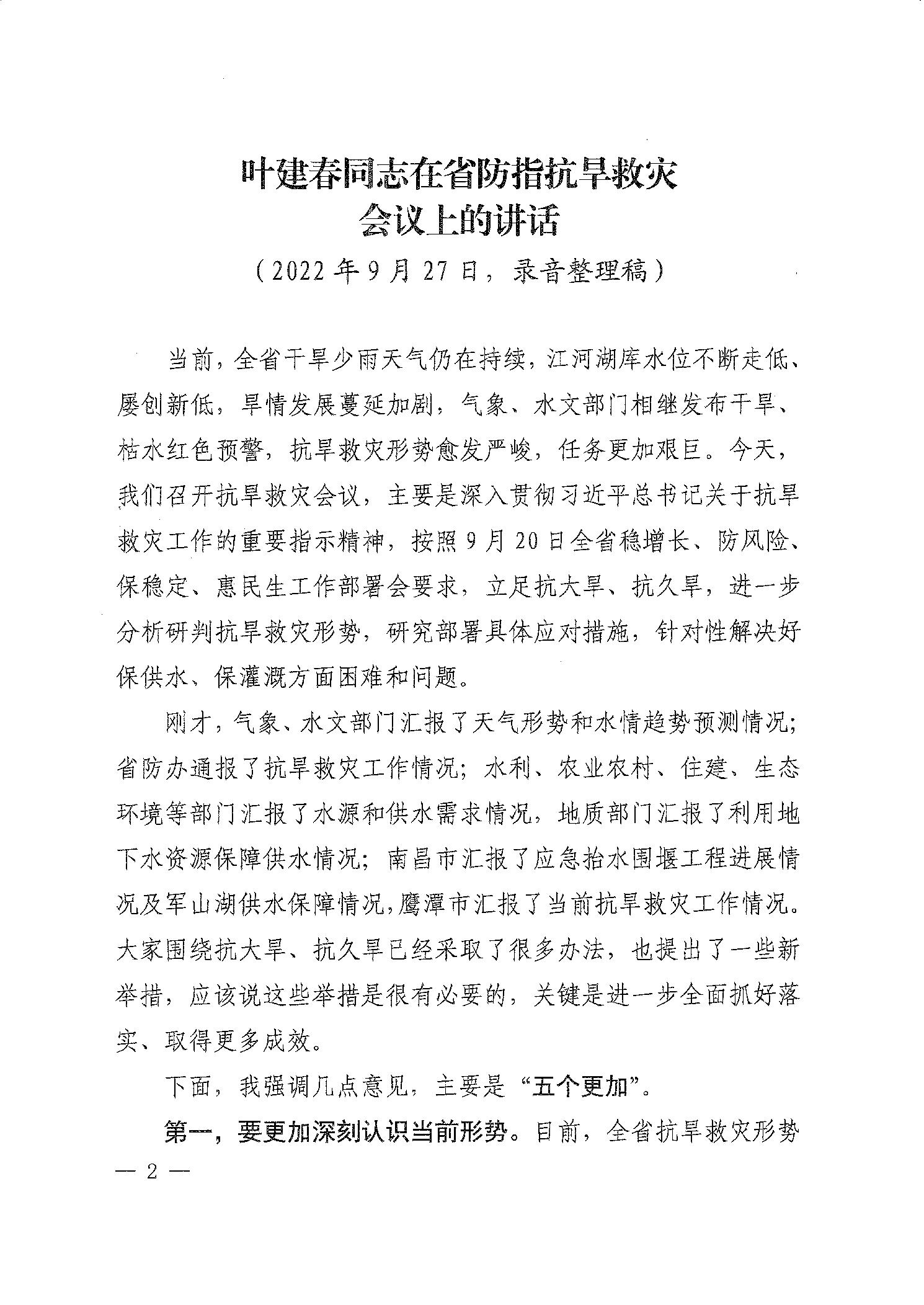 《叶建春同志在省防指抗旱救灾会议上的讲话》