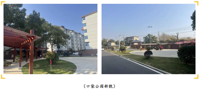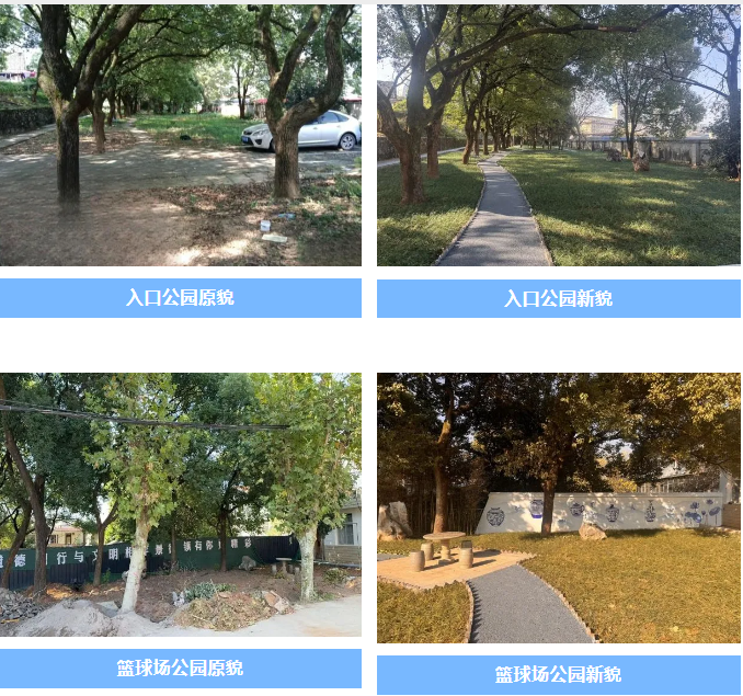 改造过程中对原有篮球场地进行翻新,还新添乒乓球桌,做到“国球进社区”,大大提升了小区原有运动场所的使用率。入口处的口袋公园如今经过改造后,路面进行铺装、杂草得以清理,并设置了休闲凉亭和景观弧形廊架,当地居民张大爷说:“现在没事就愿意来广场走走,碰到熟人便围坐下来畅谈。”