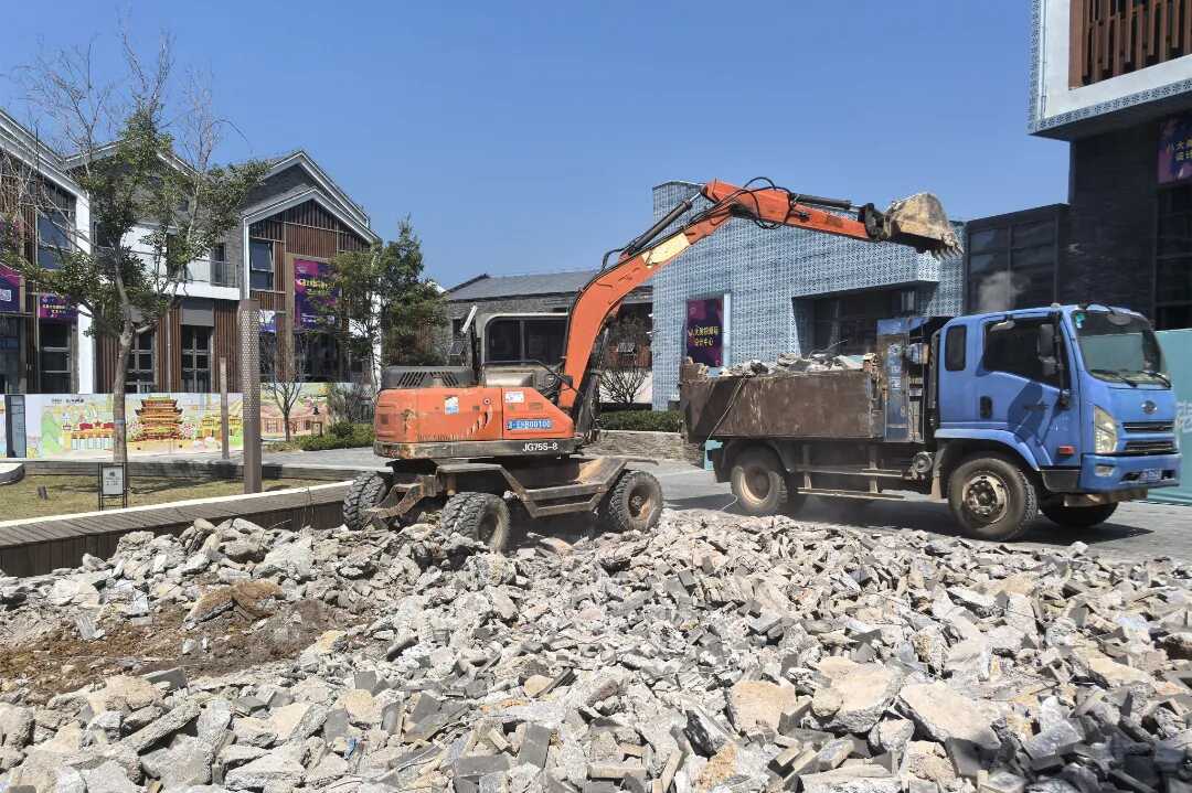 9月9日,记者来到潮玩小镇施工现场,项目主体施工已完成,展现昌江风貌的陶瓷潮玩小镇尽显大气,只见机器轰鸣、车辆穿梭,工人们正加紧进行外立面装修、场景打造、地面铺装及其他配套设施建设等工作;企业、商户也在对自身店铺进行装修、改造,现场一派如火如荼的施工景象。