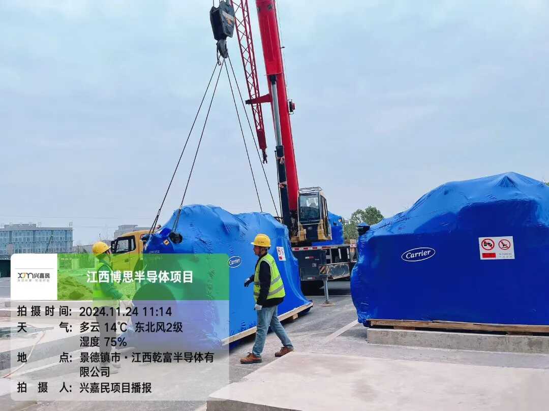 博思半导体(江西)有限公司成立于2024年5月,注册资金1.5亿人民币,是一家以MEMS芯片为核心业务的企业。企业采用全产业链的IDM模式,实现MEMS芯片的设计、制造、封测能力,具备高端智能传感器的研发和生产能力。当运输车辆停稳后,该企业技术人员迅速行动起来,他们小心翼翼地操作着吊车和起重机,将这些庞大而精密的设备逐一卸下;在设备安装现场,技术工人们戴着安全帽、手持工具,一丝不苟地进行着设备的安装工作。