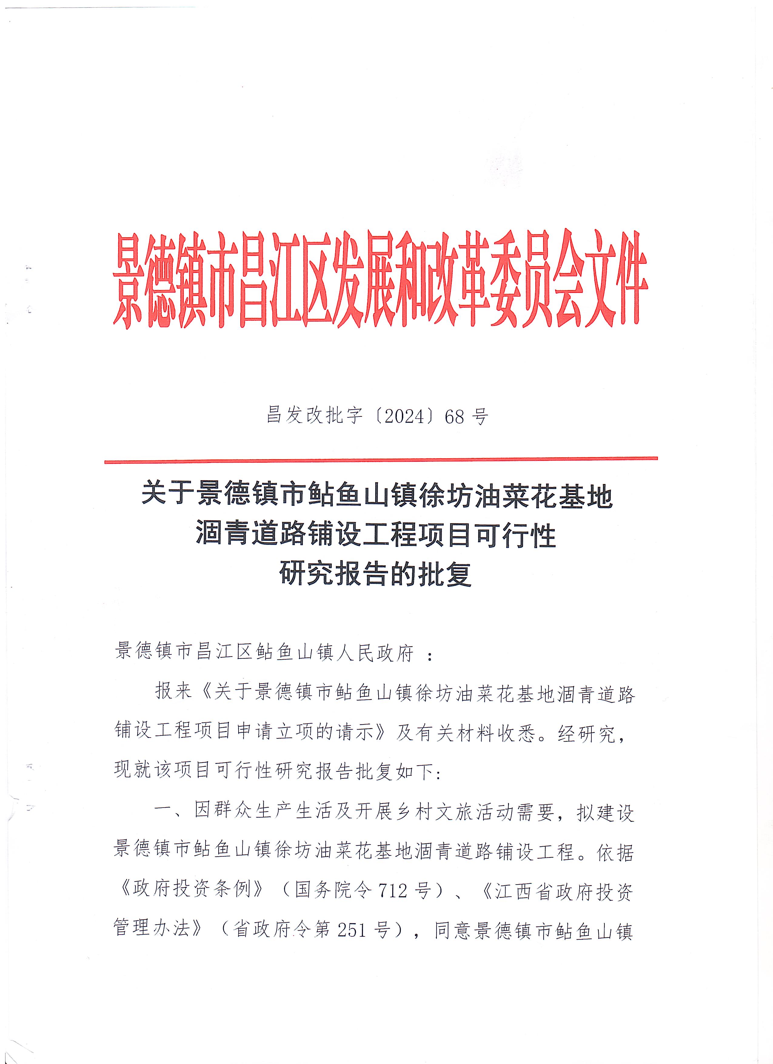 关于景德镇市鲇鱼山镇徐坊油菜花基地涸青道路铺设工程项目可行性研究报告的批复