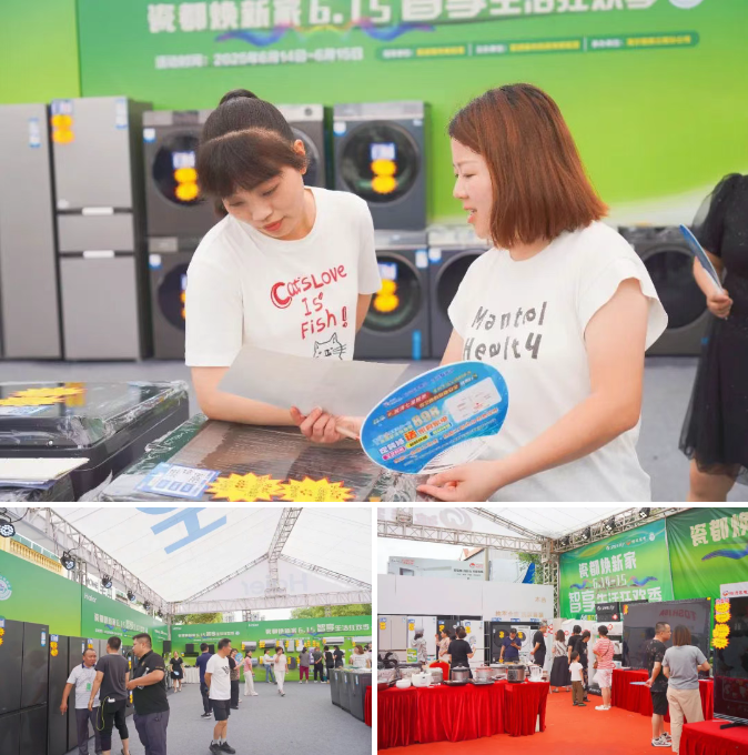 活动现场气氛热烈,人潮涌动。许多市民早早来到贸易广场,迫不及待地想要参与此次活动,亲身体验政策带来的实惠。海尔、格力等商家展示区陈列着各种型号的崭新家电,吸引着众多消费者的目光。