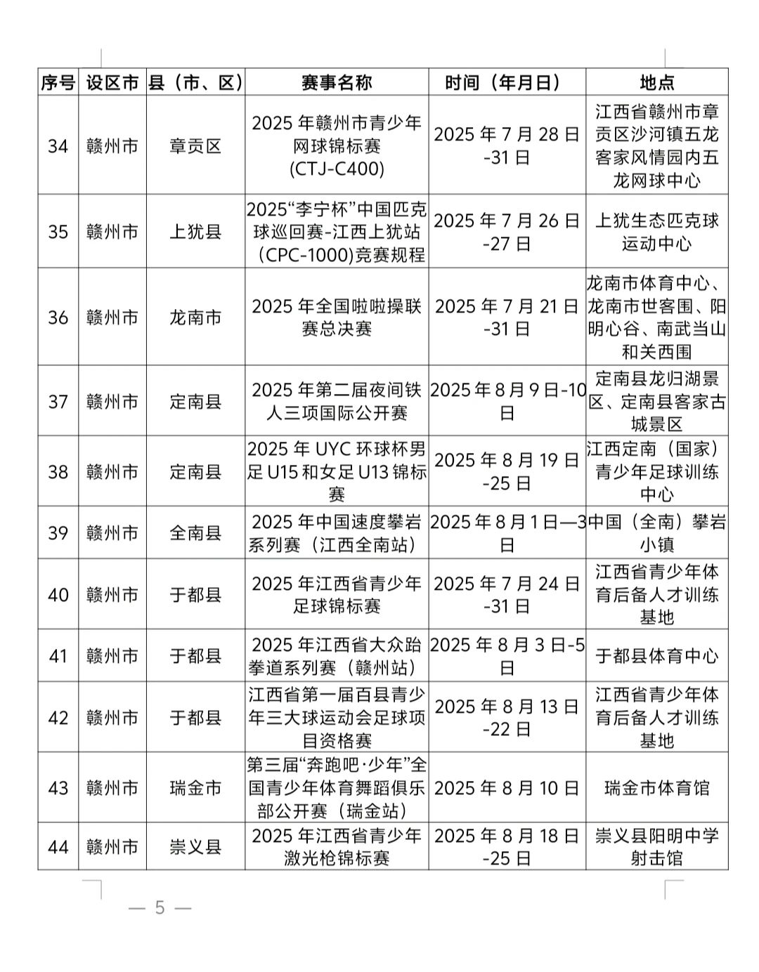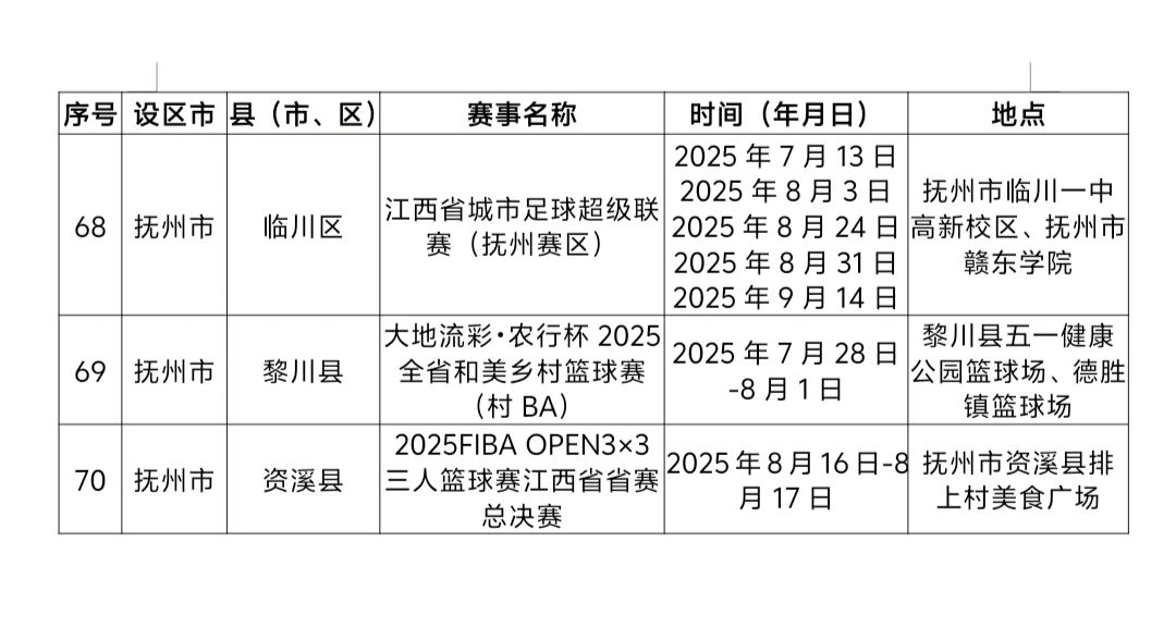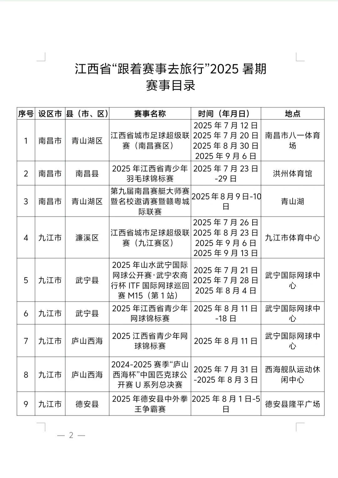 暑期来临,江西省体育局和江西省文化和旅游厅联合发布公告《江西省体育局办公室 江西省文化和旅游厅办公室关于发布“跟着赛事去旅行”2025暑期赛事目录的公告》,坚持“以赛促旅、以旅兴赛”,推动文体旅资源在暑期深度融合,丰富群众暑期生活,激发消费活力,助力打造特色文体旅品牌。