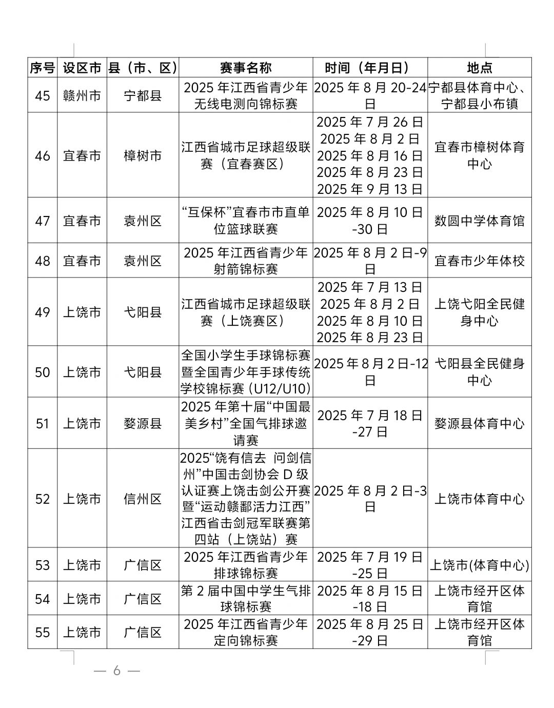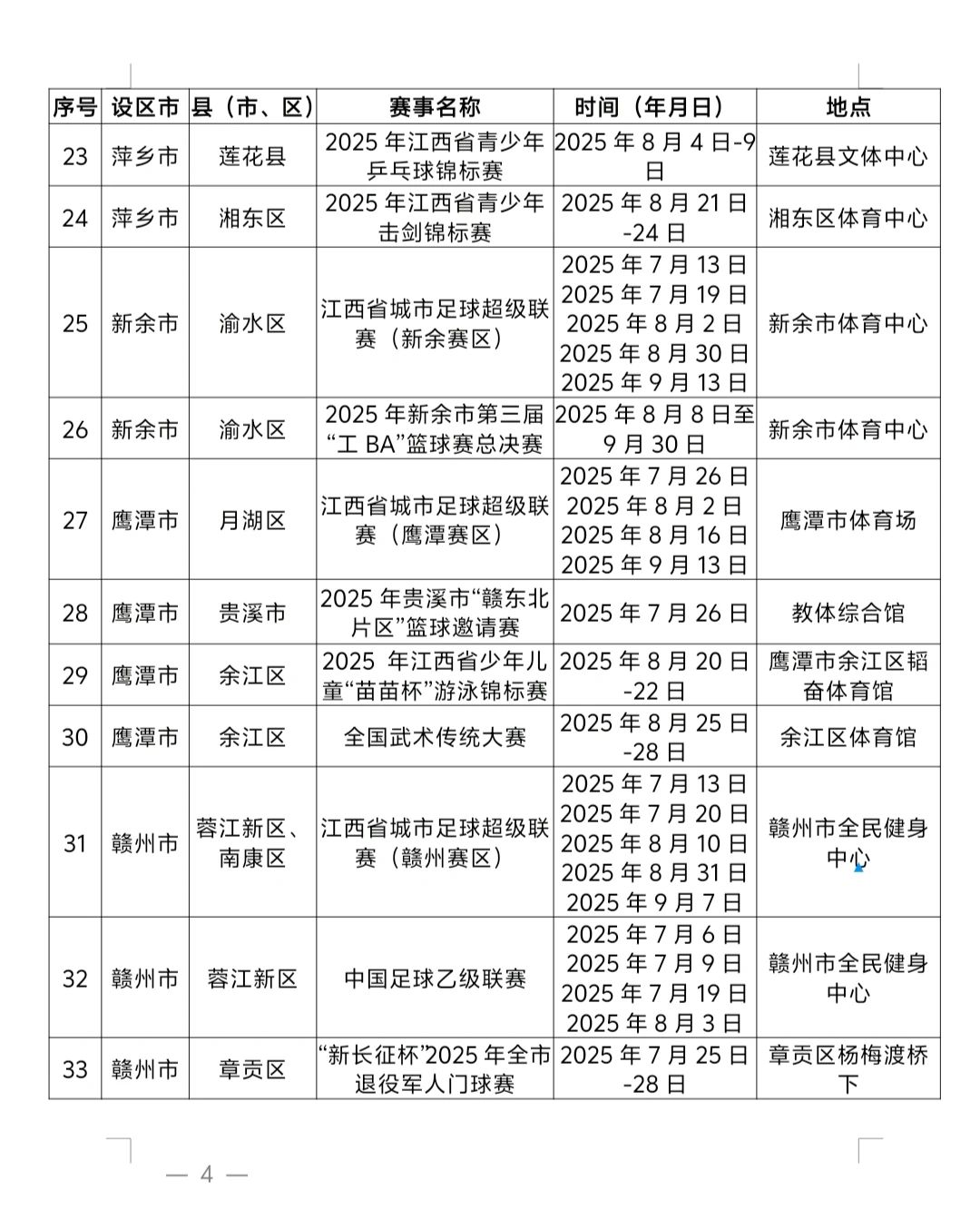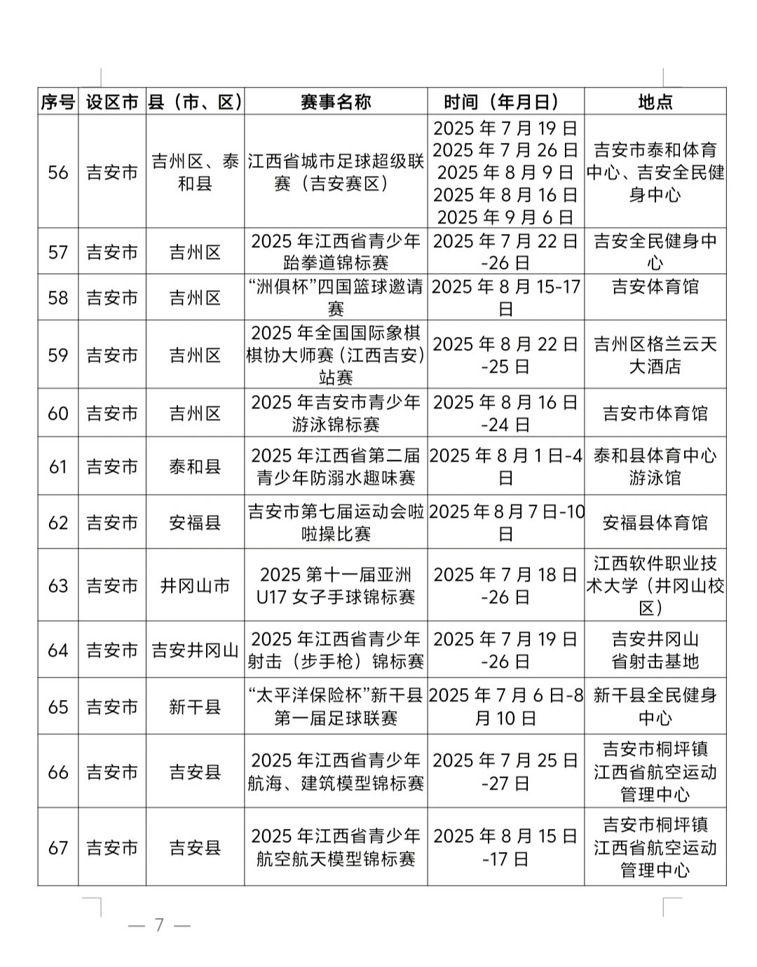 暑期来临,江西省体育局和江西省文化和旅游厅联合发布公告《江西省体育局办公室 江西省文化和旅游厅办公室关于发布“跟着赛事去旅行”2025暑期赛事目录的公告》,坚持“以赛促旅、以旅兴赛”,推动文体旅资源在暑期深度融合,丰富群众暑期生活,激发消费活力,助力打造特色文体旅品牌。