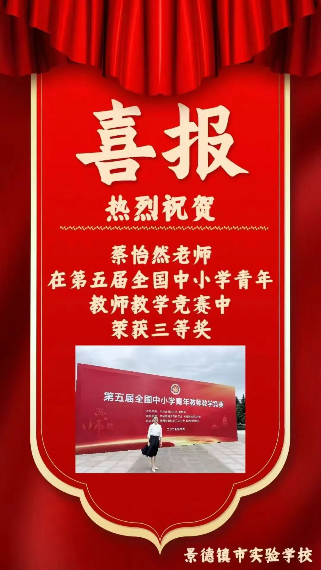 近日,从第五届全国中小学青年教师教学竞赛传来喜讯,景德镇市实验学校蔡怡然老师凭借扎实的教学功底与精彩课堂呈现,荣获三等奖。