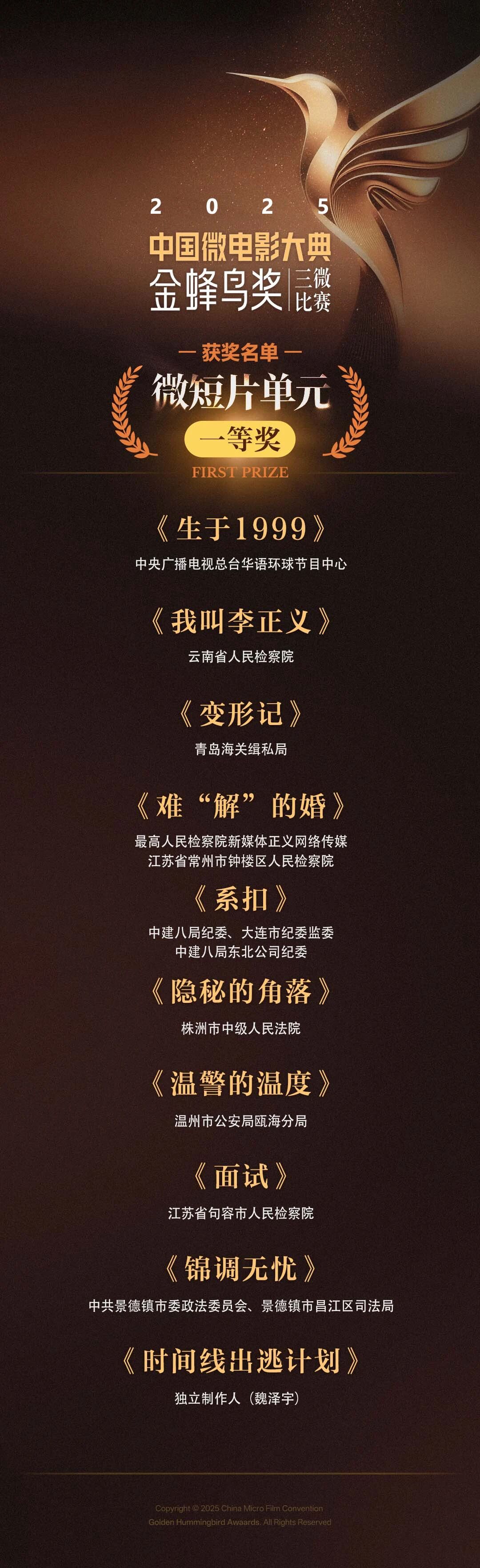 2025·中国微电影大典“金蜂鸟奖”三微比赛历经层层筛选与评委会的严谨评审,获奖表彰名单正式出炉,旨在表彰、奖励各类优秀作品和创作人才。本次比赛微电影、微短片、微视频、微纪录、微创新五大创作单元佳作云集,每一份荣耀都承载着光影人的初心梦想,都铭记着中国微电影大典的高光时刻。