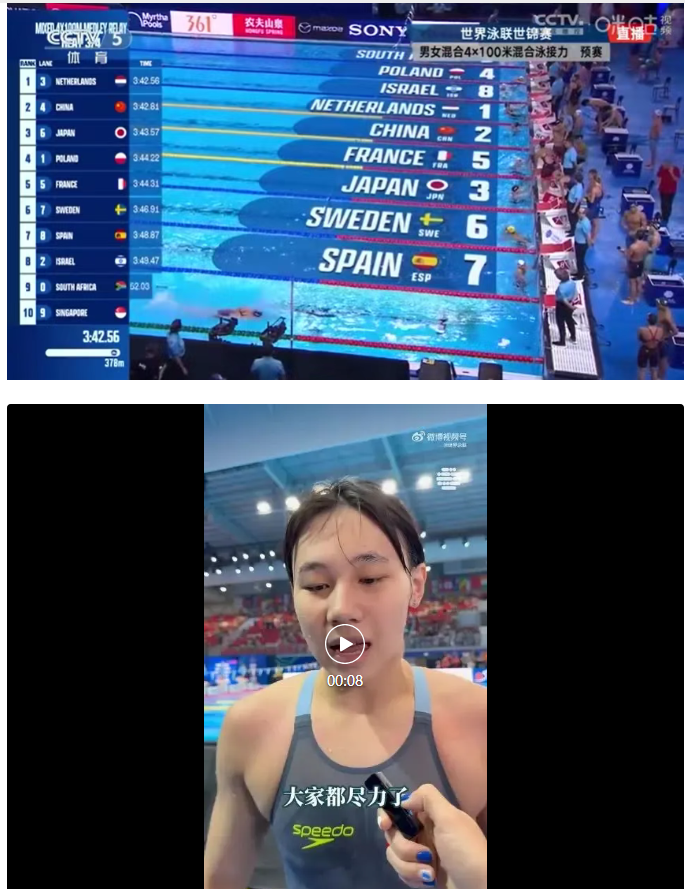 7月30日,新加坡世界泳联世锦赛男女4X100米混合泳接力预赛,由徐嘉余、董志豪、余依婷、程玉洁组成的中国队游出3分42秒81,以小组第二、总排名第三晋级决赛。