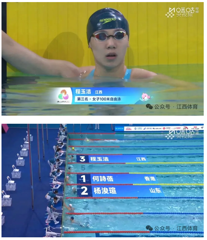 11月15日晚,在深圳大运中心游泳馆举行的第十五届全国运动会女子100米自由泳决赛中,来自昌江区代表江西参赛的程玉洁以53秒65的佳绩摘得该项目铜牌,为江西游泳队赢得本届全运会第二枚奖牌!